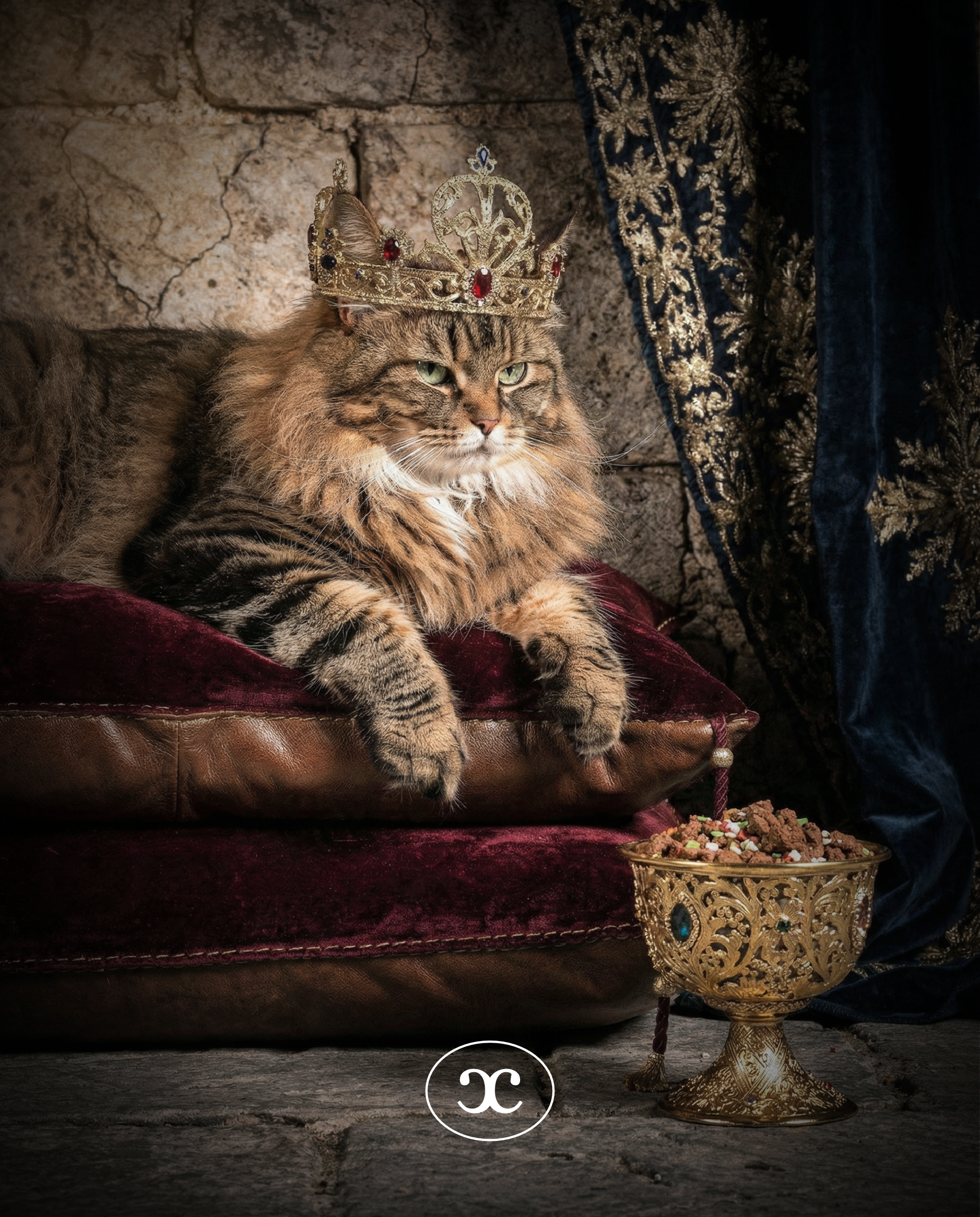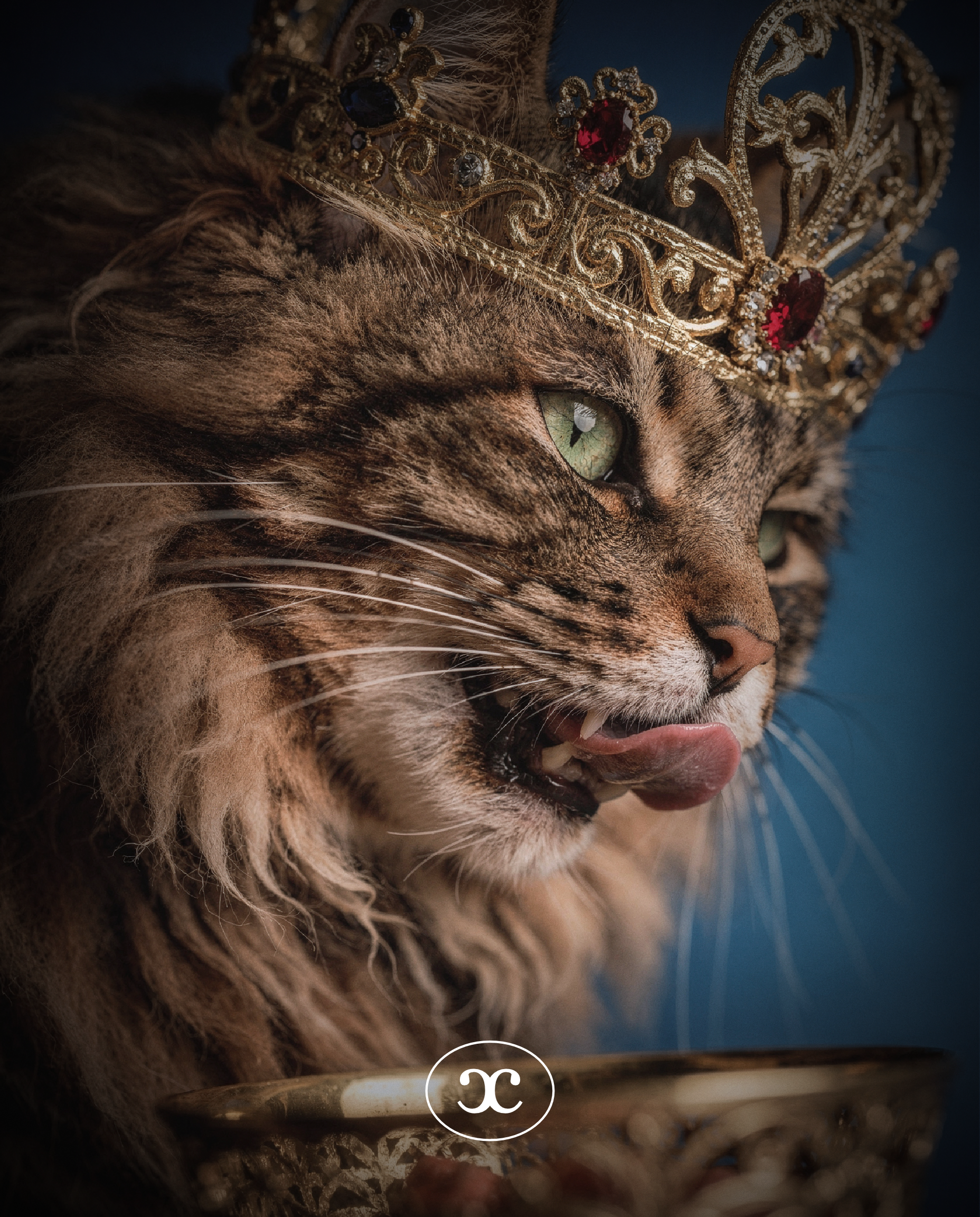 A series of key visuals exploring the theme of feline nobility. The project uses anthropomorphic character design and dramatic lighting to create a humorous yet premium brand identity.
